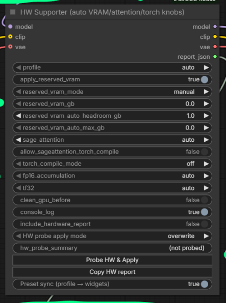 This is a big one. The node inspects your actual hardware and suggests (or applies) the most appropriate generation parameters based on your setup. VRAM, attention strategy, torch knobs, tiling, decode strategies β all contextualized to your machine.