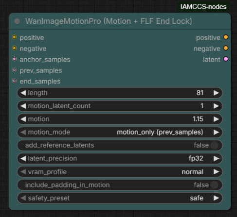 Key parameters: motion amplitude (1.0 to 2.0), motion mode, safety preset (safe / safer / legacy), and VRAM profile for different hardware budgets. If you are using the WAN 2.2 SVI Pro 2 workflow, this node is the core of the motion conditioning block.